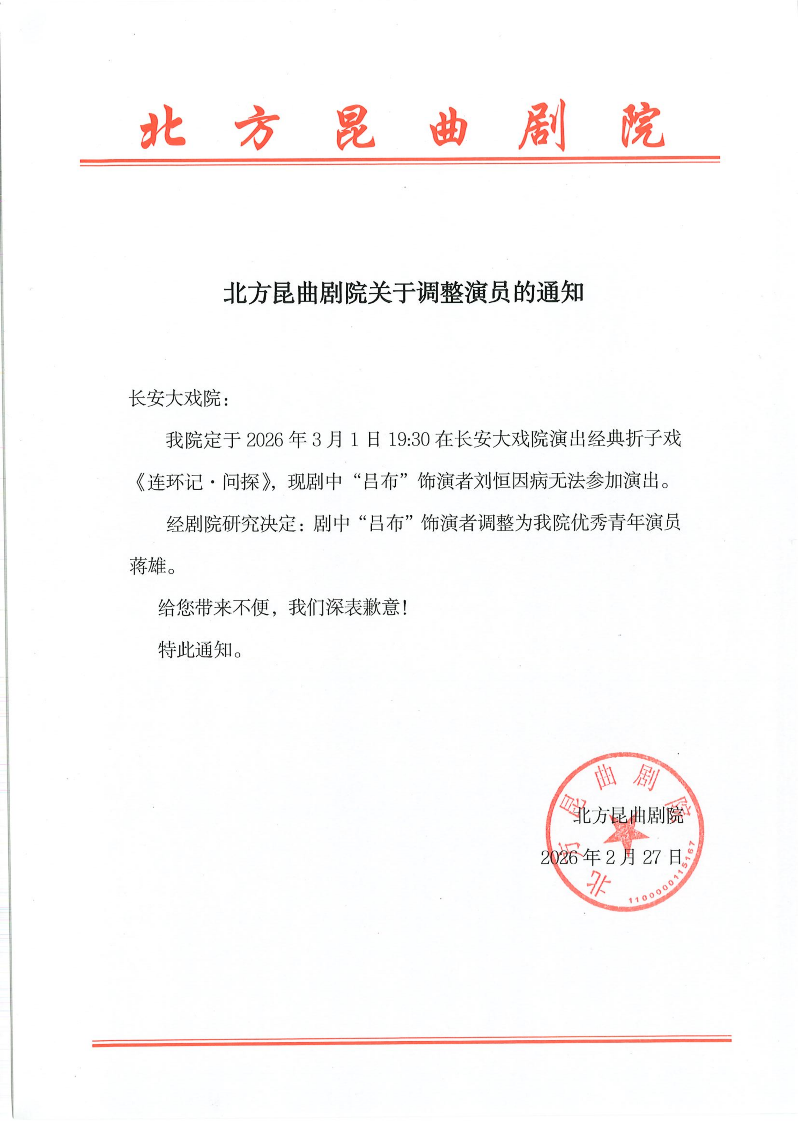 我院定于2026年3月1日19:30在长安大戏院演出经典折子戏《连环记·问探》,现剧中“吕布”饰演者刘恒因病无法参加演出。